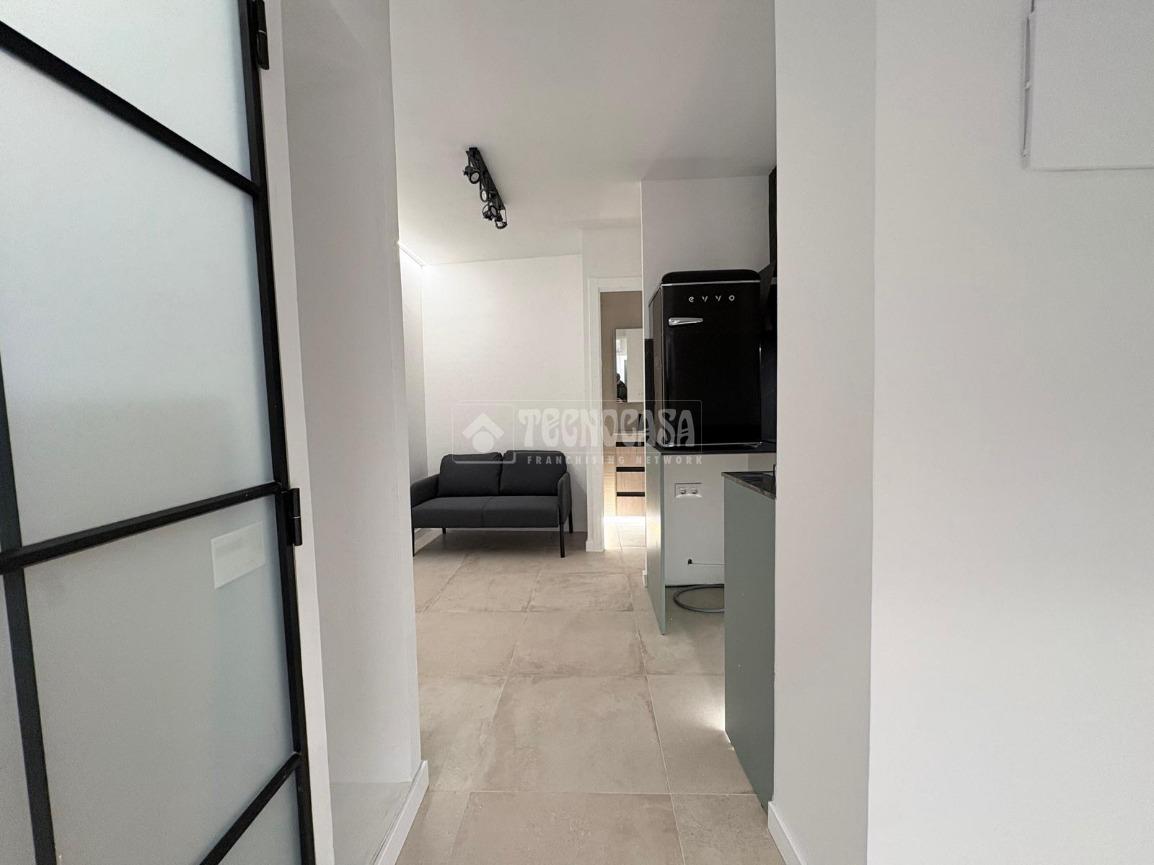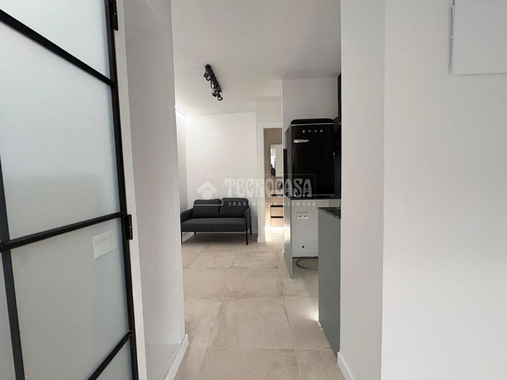 Al entrar, serás recibido por un acogedor recibidor que distribuye la vivienda en un amplio salón-comedor con cocina americana. A su vez, daremos acceso a un emblemático cuarto de baño con plato de ducha.